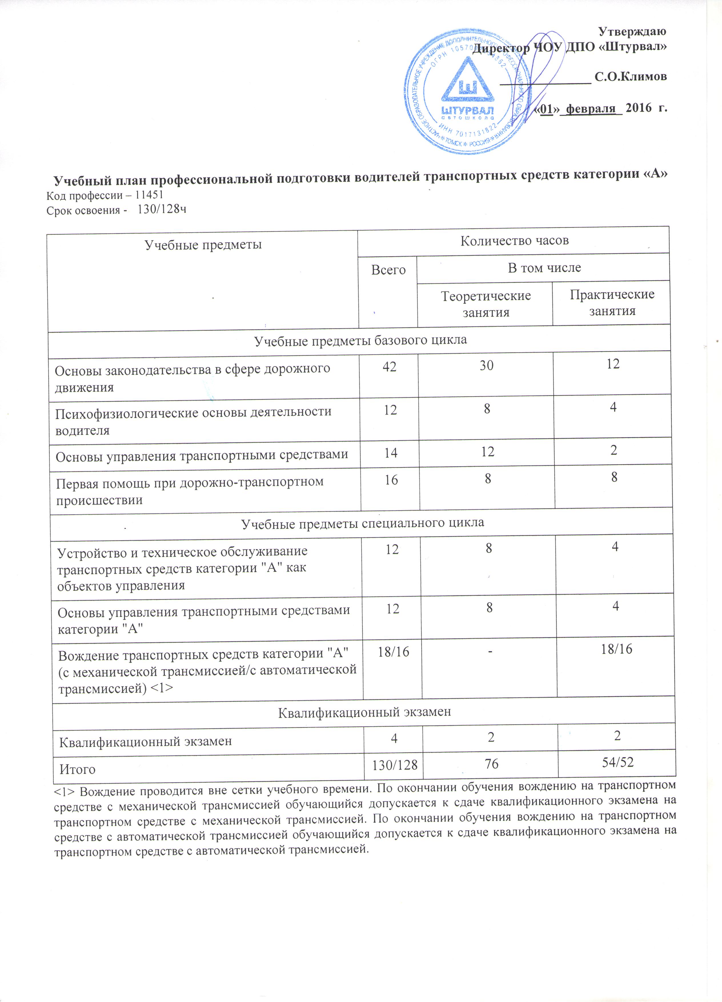 - Рабочая программа профессиональной подготовки водителей транспортных средств категории “А”